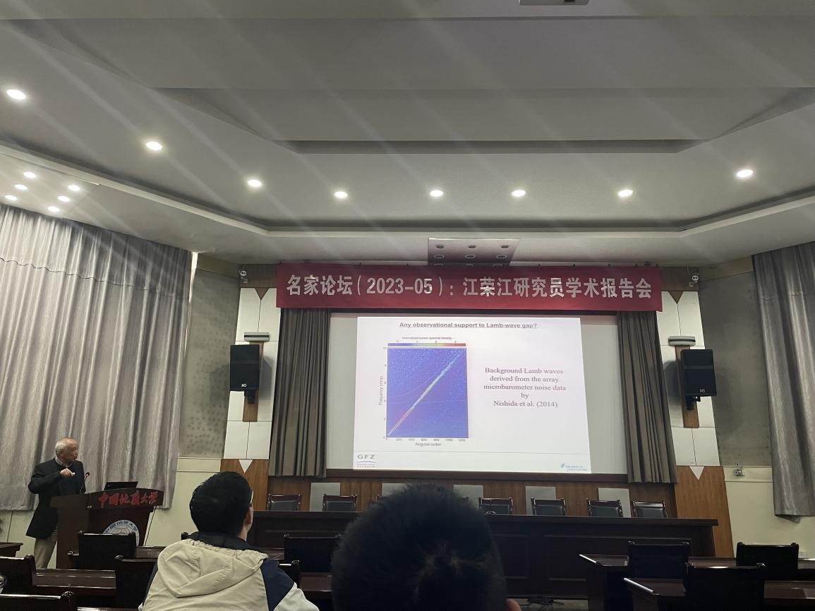 会议伊始熊熊教授为报告致辞,并为会场的师生介绍了汪荣江教授在地球物理学界的主要贡献。随后汪荣江教授介绍了最近关于2022年汤加火山爆发的创新工作。汤加火山爆发期间在全球范围内引起了大气和固体地球的强烈震荡,激发了全球性的大气次声波、重力波和Lamb波震荡。通过远离震源的气压计和位于地表附近的地震仪,我们接收到了粒子震荡性质和主频不同的信号。这些信号分别来源于大气震荡和固体地球震荡,并形成了不同模态。而固体地球的模态和大气的模态并不相同,并且他们之间还存在一个不连续的间断点,这与过去学界的认知是不同的。汪荣江教授的研究为我们揭示了新的全球模态分布模型。